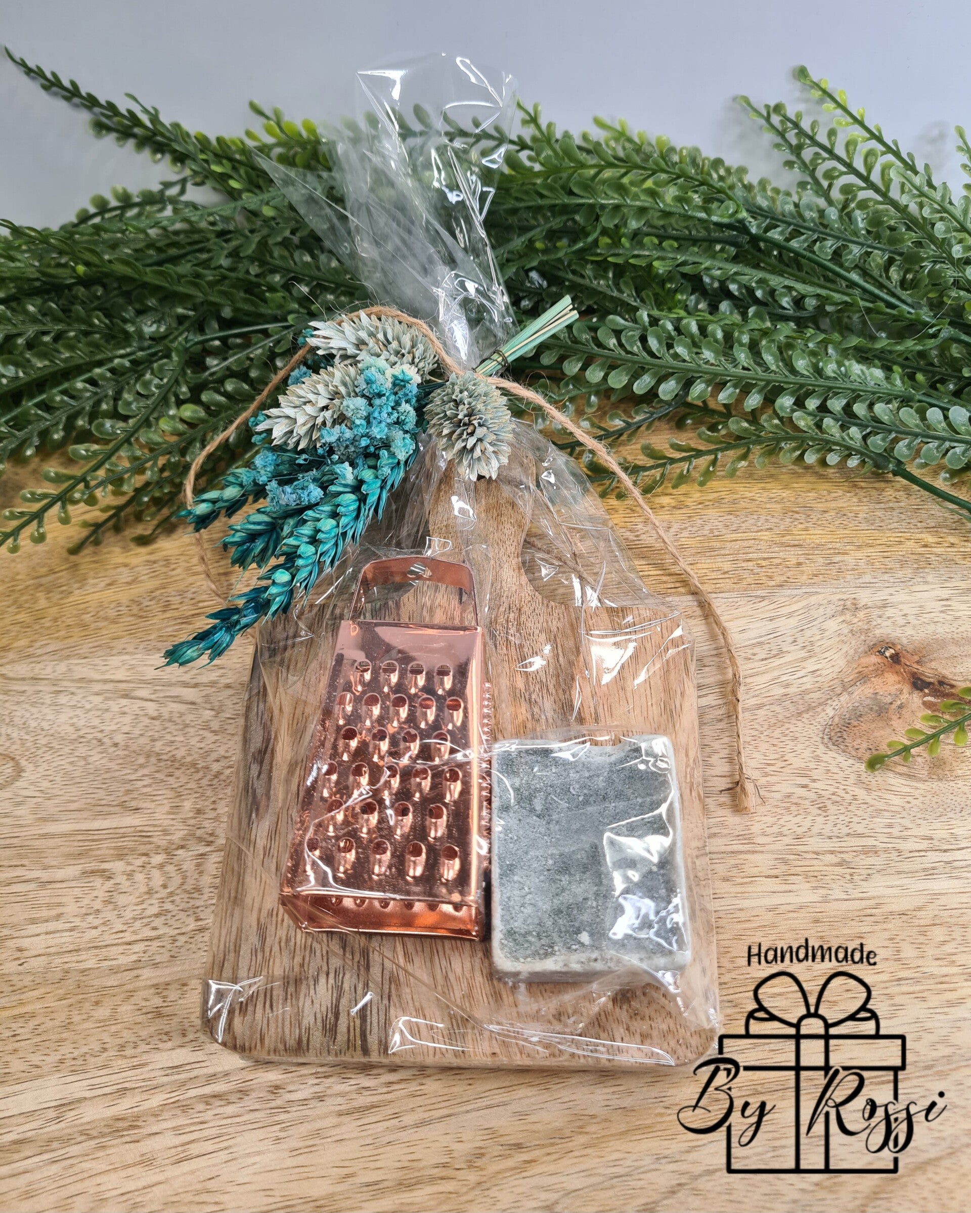 Leuk plankje met een heerlijk geurend amberblokje blue lady met een raspje in de kleur rosegoud.
