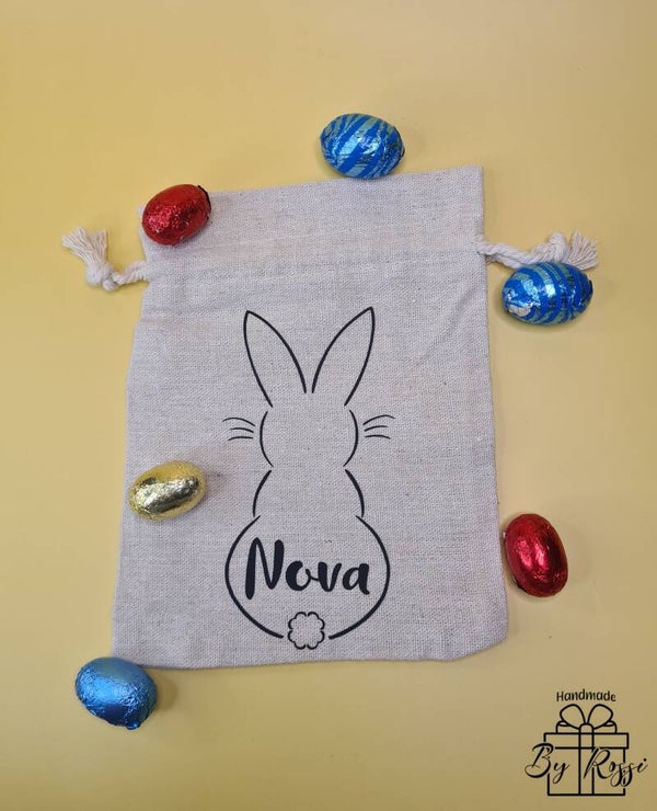 Bewaar de paaseitjes van je kindje in dit handig zakje met een leuk haasje met daar tussen de naam van je kindje.