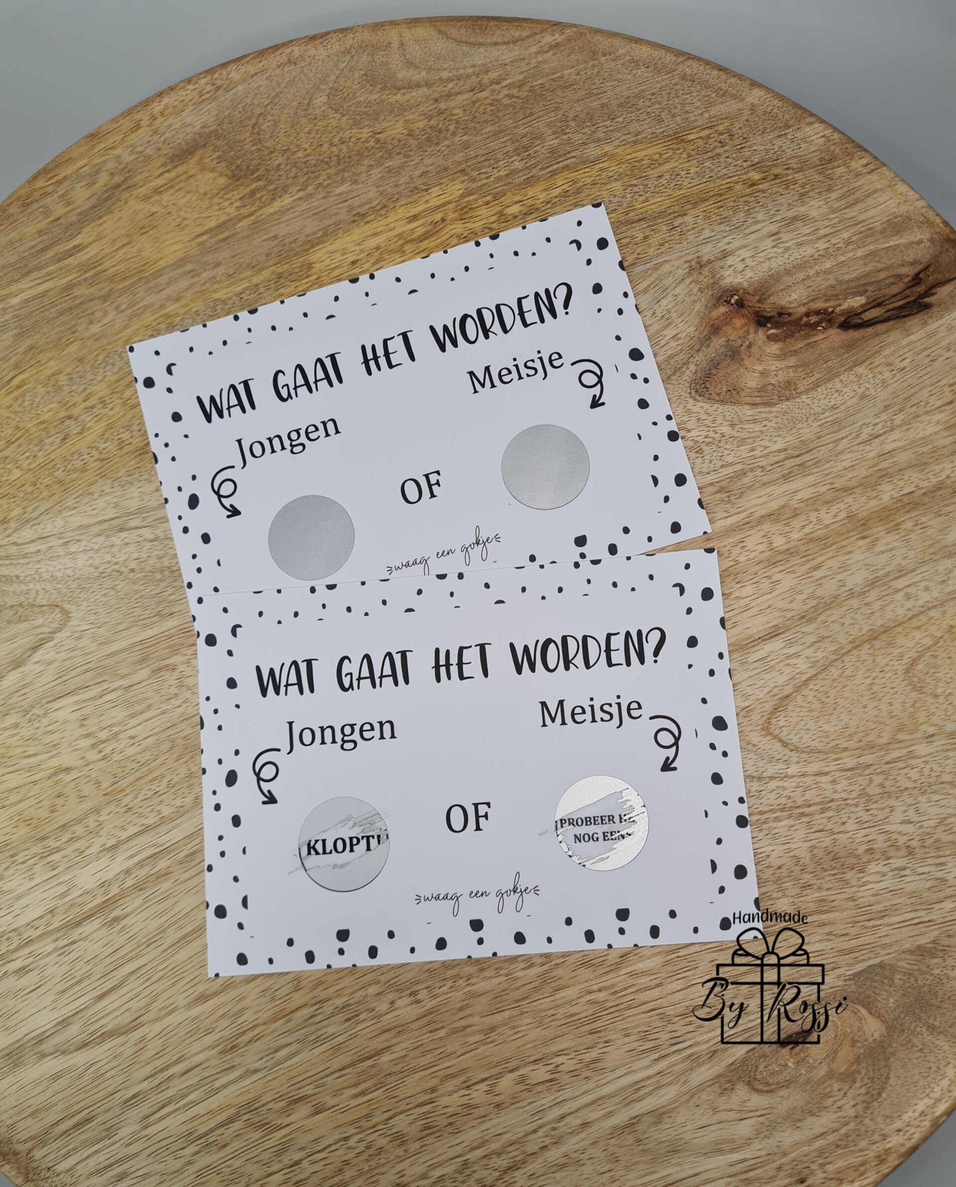 Wil jij je omgeving op een originele manier laten weten wat het geslacht van jullie ongeboren baby is? Onder de zilveren krassticker staat de tekst die dus pas zichtbaar wordt als het weggekrast wordt met een muntje.